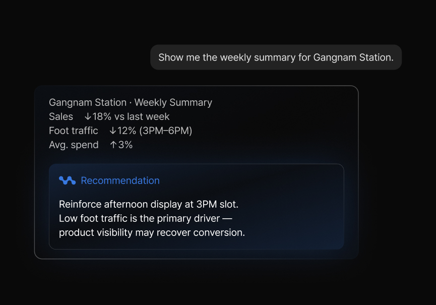 A standard dashboard shows you numbers. StoreAgent tells you what to do with them. Every data point comes paired with a concrete action recommendation — generated by an AI trained on accumulated store operations data, and grounded in real performance outcomes from your own network.